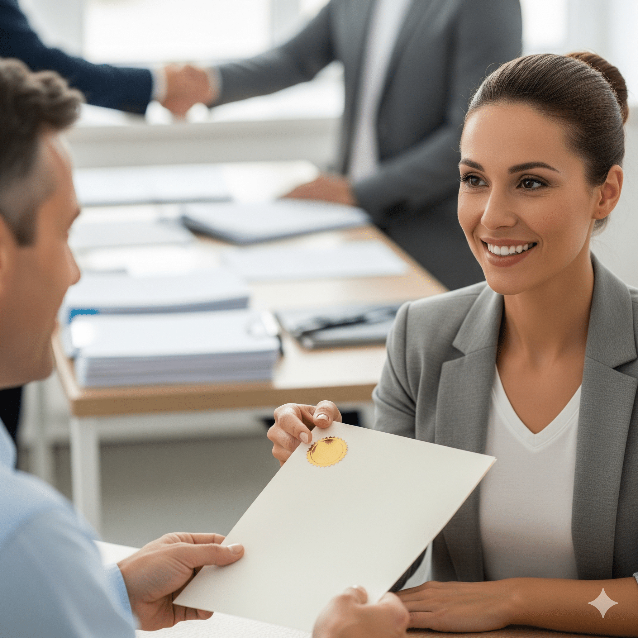 A imagem mostra uma mulher sorrindo, sentada em uma mesa de escritório, recebendo um documento de um homem. Ela está vestindo um blazer cinza claro sobre uma blusa branca. O homem, que está de costas, estende o documento com um selo dourado. Ao fundo, parcialmente desfocado, há uma pilha de pastas e dois homens apertando as mãos, sugerindo uma negociação ou um acordo bem-sucedido. A cena transmite uma sensação de alívio e sucesso na conclusão de um processo burocrático